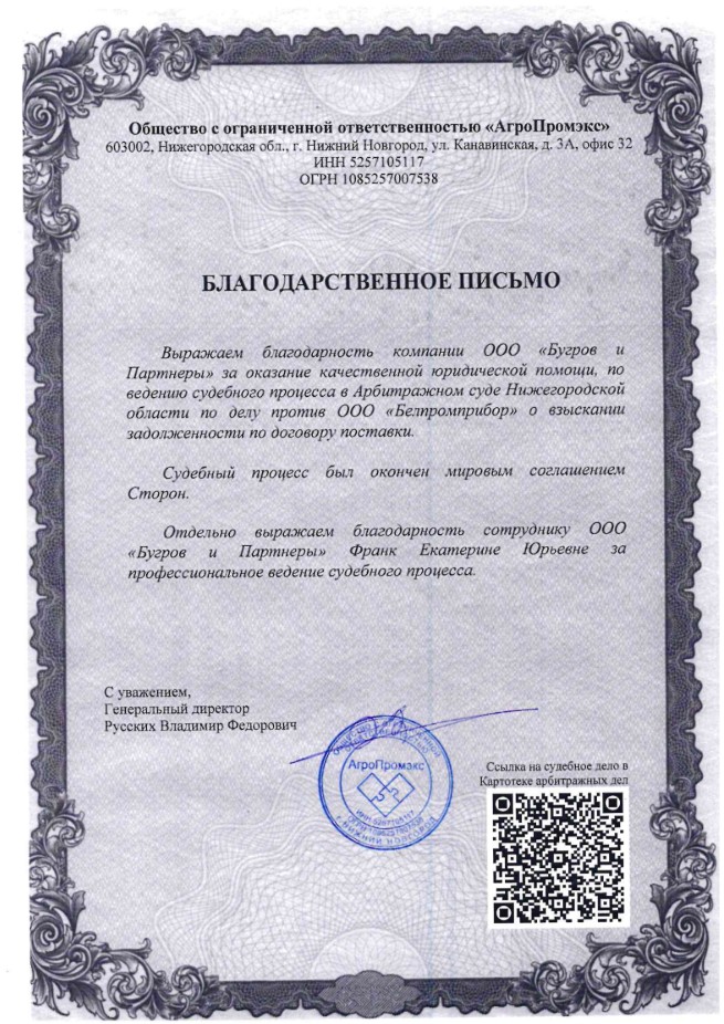 За оказание качественной юридической помощи по защите интересов, а также за положительный исход дела в Арбитражном суде по делу о взыскании задолженности.