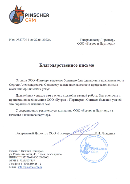 Благодарственное письмо от ИП Ливадин Егор Владимирович